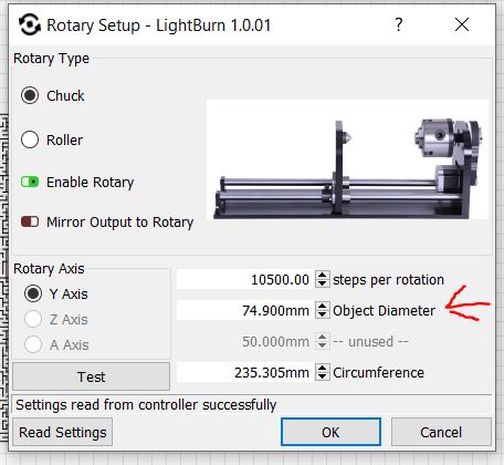 20:23, 18. Aug. 2022 Rotary.JPG (Datei) 42 KB LightBurn Settings Window for Rotary Axis 1