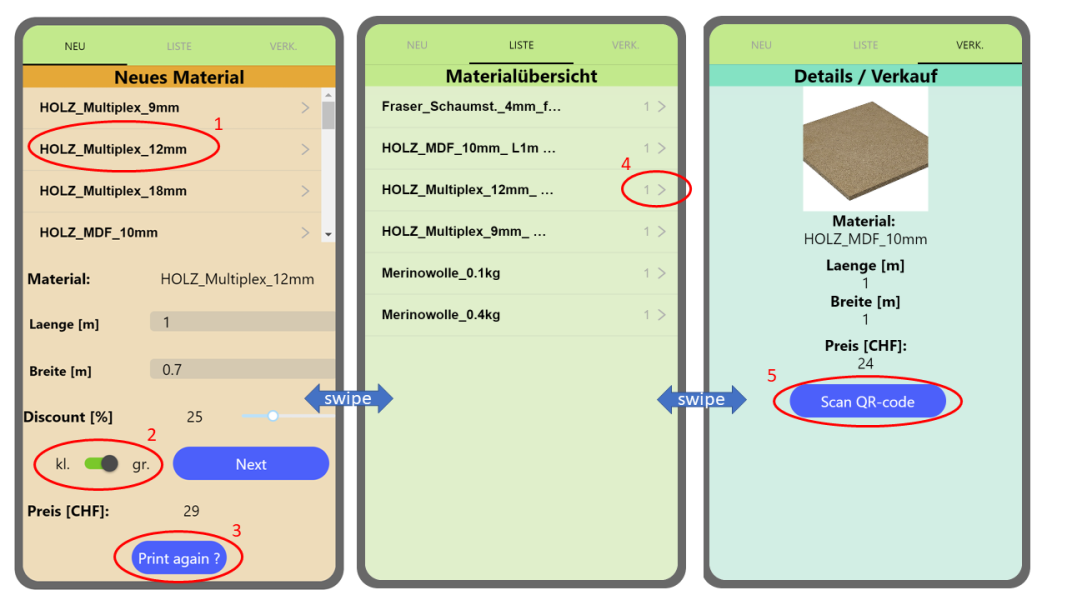 Um Material verkaufen zu können muss zunächst der QR-Code auf dem Material gescannt werden (5). Erst nach erfolgreicher Identifikation des Materials und Sicherstellung, dass es nicht bereits verkauft wurde, erscheint der "Verkauft" Button. Wird dieser gedrückt, wir das Material entsprechend in der Datenbank erfasst und kann nicht nochmals verkauft werden.