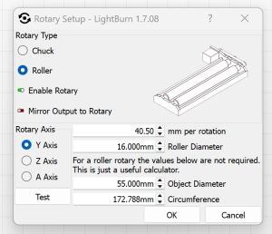 2. Unter Laser Tools / Laserwerkzeuge das Rotary Setup wählen und die Einstellungen gemäss folgendem Bild übernehmen