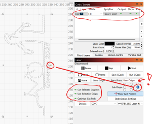4. Die Lasereinstellungen gemäss folgendem Bild übernehmen. Der grüne Punkt auf dem Motiv stimmt mit der aktuellen Position des Lasers überein.