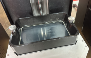 4. Den Tank auf der Belichtungsfläche des Druckers mit den zwei Rändelschrauben gleichmäßig befestigen – die Schrauben nur leicht anziehen.